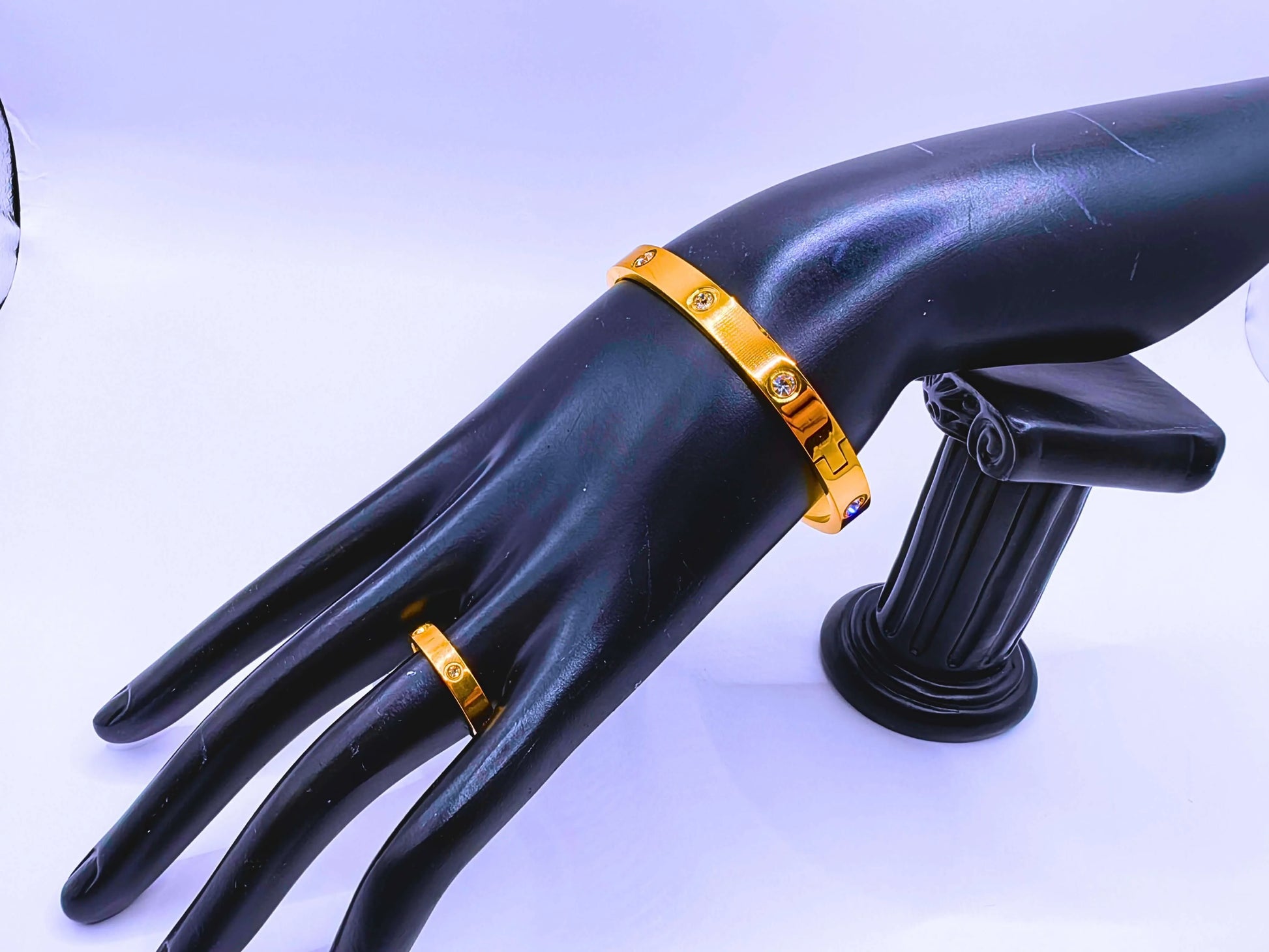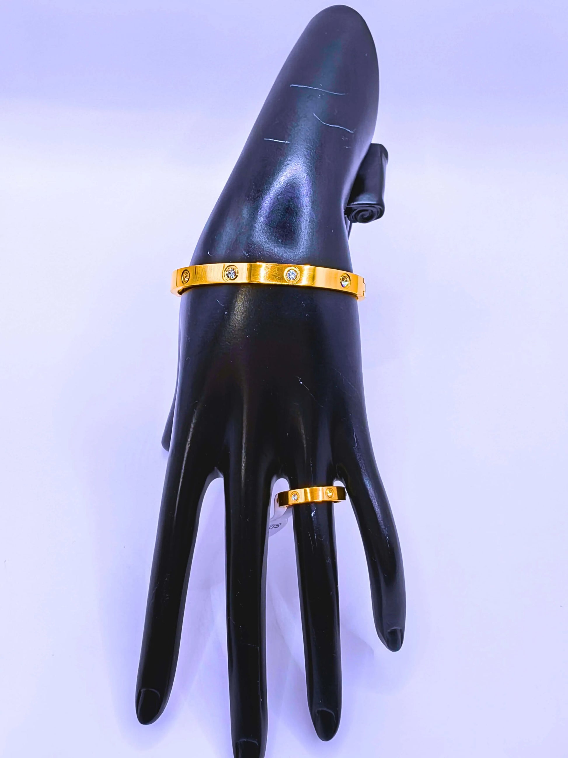 Elegante set de pulsera y anillo de acero inoxidable con circonitas cúbicas blancas. Baño de oro 10k que garantiza durabilidad y brillo. Diseño sofisticado ideal para cualquier ocasión.