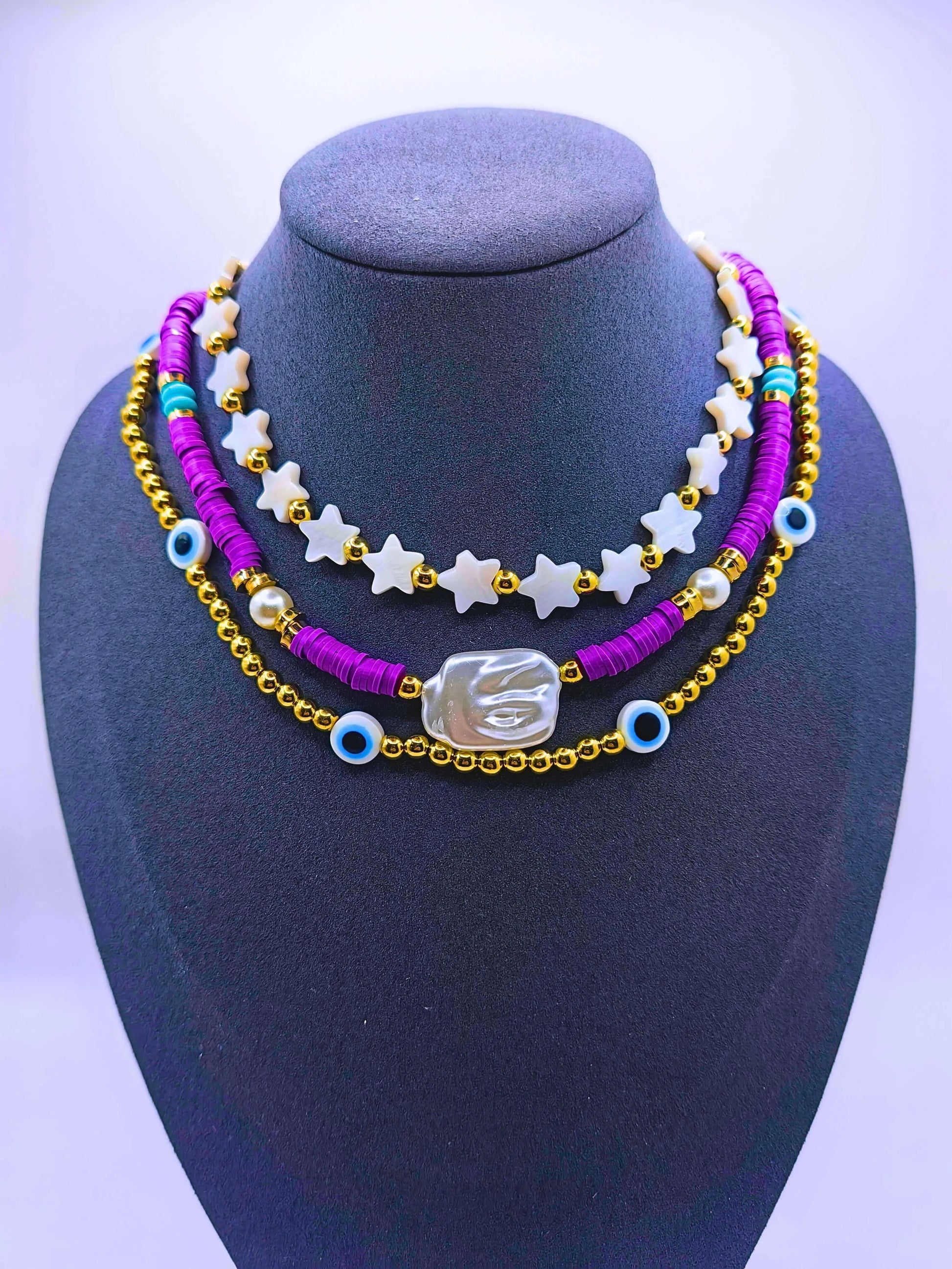 Collar triple bohemio en tonos morados que captura la esencia del estilo libre y sofisticado. Cada capa transmite elegancia moderna con detalles inspirados en la tradición, incluyendo el icónico ojo turco como símbolo de protección. Perfecto para quien busca expresar su personalidad con una pieza versátil que combina con cualquier look. Diseño accesible sin comprometer el impacto visual que define tu estilo.