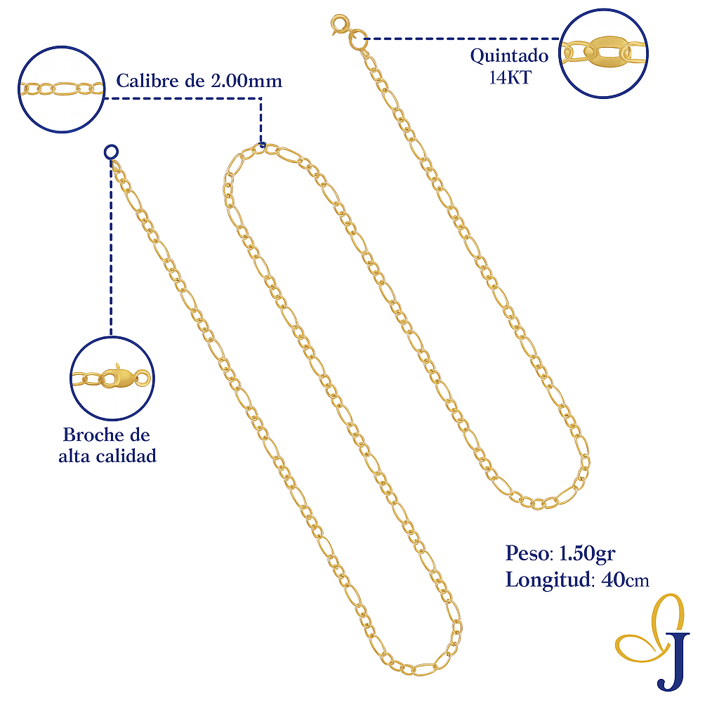 Esta cadena de oro de 14K en estilo Figaro es una pieza única y sofisticada para añadir a cualquier colección de joyería fina. Con su brillante lustre dorado y su diseño italiano clásico, es una joya que sin duda disfrutarás luciendo en todas las ocasiones. Esta pieza te da el equilibrio ideal entre lujo, durabilidad y resistencia además de seguridad con su broche de Argolla.