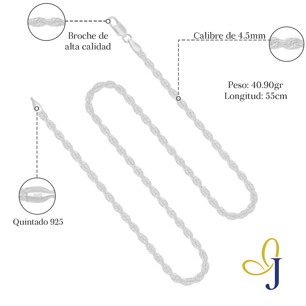 Cadena De Plata 925 Estilo Torsal De 55 Cm Calibre 4.5 Mm
