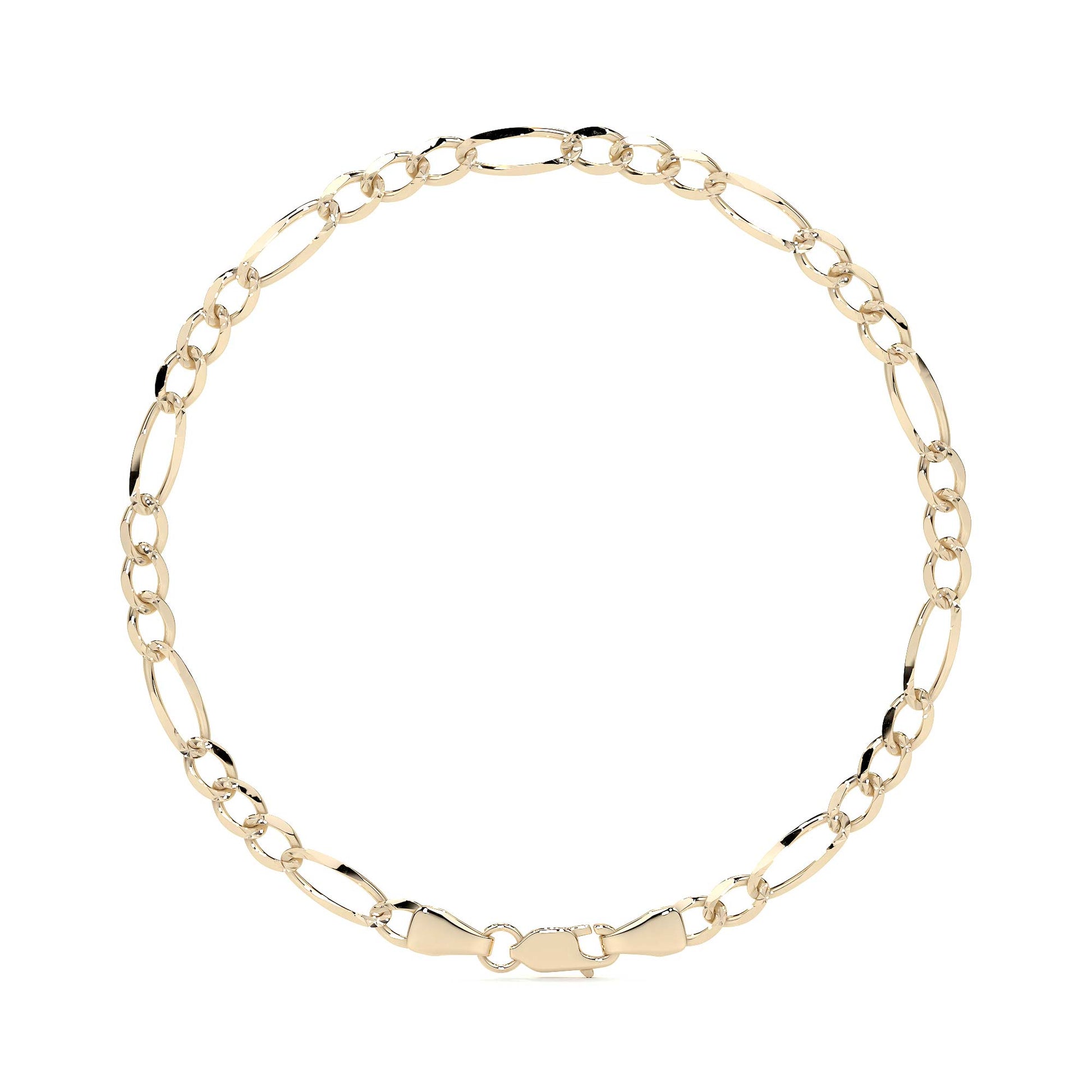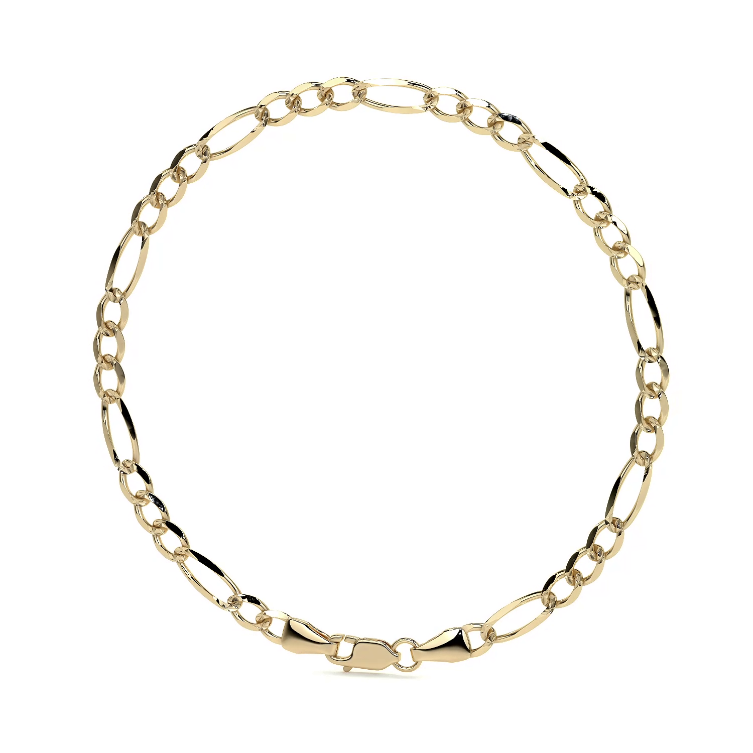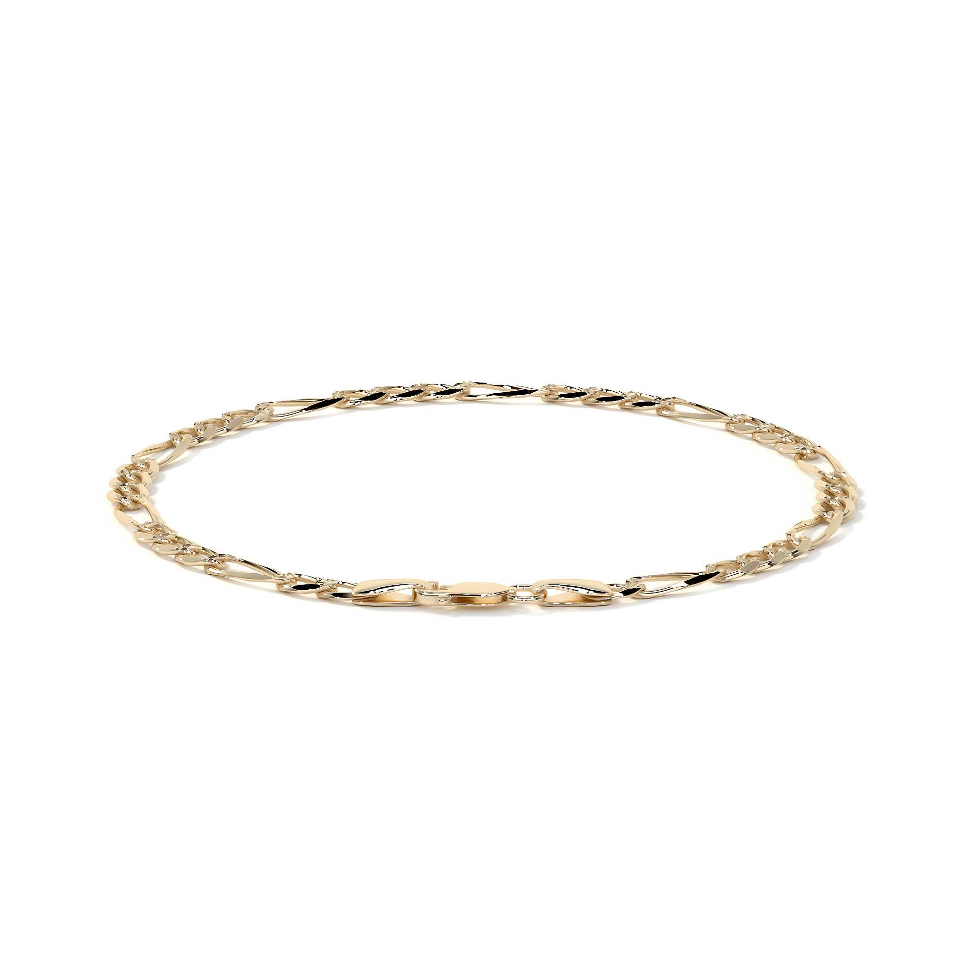 El estilo Figaro 3x1, compuesto por tres eslabones cortos y uno largo, brinda una apariencia clásica y refinada. Con un calibre de 3.5 mm, esta esclava de oro es lo suficientemente robusta para el uso diario, manteniendo al mismo tiempo una estética elegante.