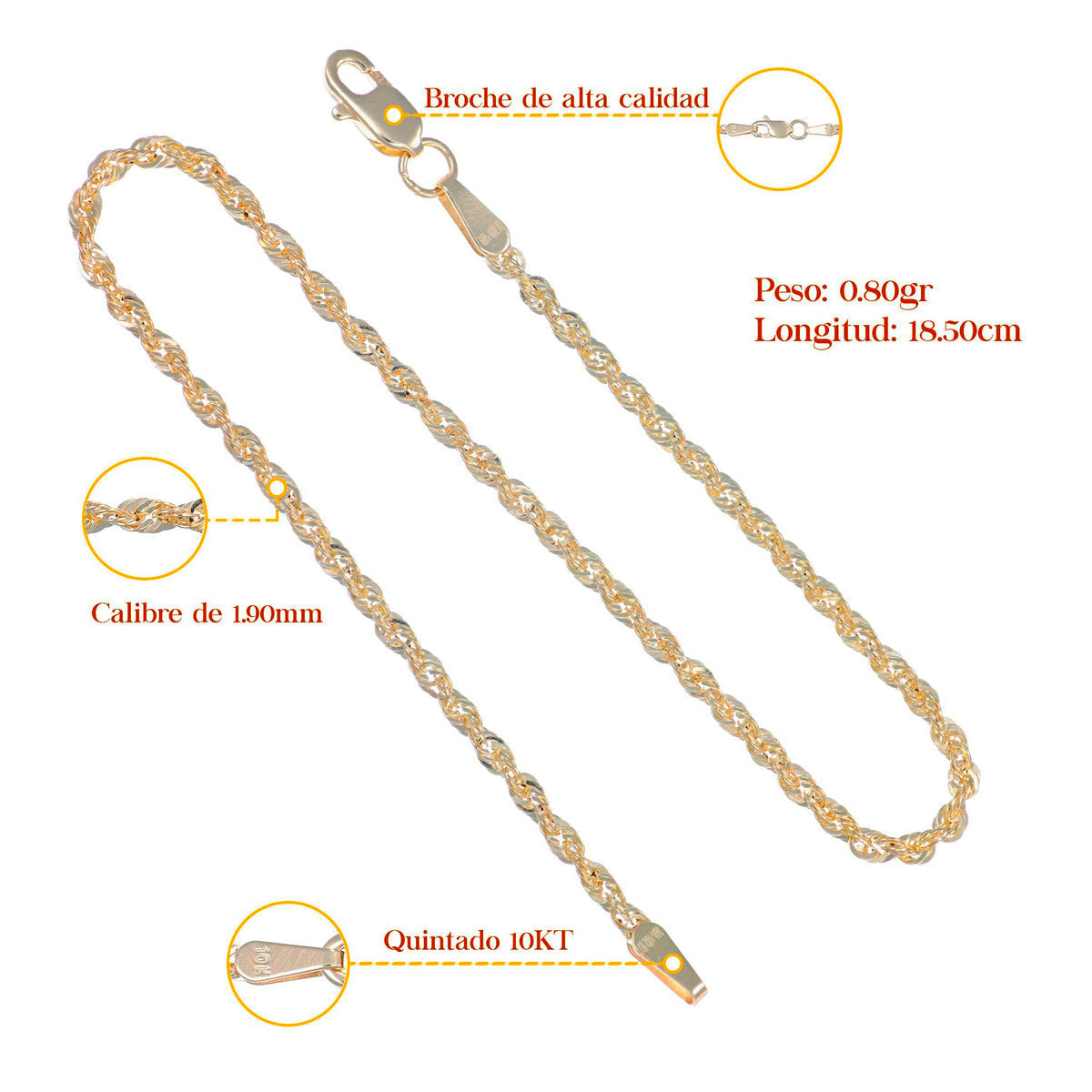Presentamos nuestra pulsera de oro de 10 quilates en el elegante estilo italiano Torsal. Esta joya demuestra la delicadeza y maestría de la joyería italiana.**Medida: 18.5 CM****Peso: 0.8 Gramos****Quilataje: 10K** (NO ES CHAPA NI BAÑO DE ORO)Características:Material: Esta pulsera está hecha de oro auténtico de 10 quilates, ofreciendo un equilibrio ideal entre lujo, durabilidad y resistencia. El oro de 10 quilates mantiene un brillo dorado radiante que perdura a lo largo del tiempo.Estilo: La pulsera presenta el diseño Torsal, caracterizado por sus eslabones entrelazados que crean una textura y un brillo únicos. Este estilo aporta un toque de sofisticación y elegancia a cualquier look.Calibre: Con un calibre de 1.9 milímetros, la pulsera es fuerte y duradera, manteniendo al mismo tiempo una apariencia delicada y femenina.Longitud: 18.5 centímetrosBroche de Argolla: La cadena incluye un broche de argolla que es seguro y fácil de usar, y que se integra de manera armoniosa con el diseño de la cadena.Autenticidad: Cada pulsera viene con un certificado de autenticidad que garantiza su pureza y calidad. El broche de la cadena está marcado con el quilataje, la marca del fabricante 'FILK', y el país de origen 'Italia', confirmando que estás adquiriendo una joya auténtica de calidad excepcional.Esta pulsera de oro de 10 quilates en estilo Torsal es una pieza única y sofisticada para añadir a cualquier colección de joyería fina. Con su brillante lustre dorado y su diseño italiano clásico, es una joya que sin duda disfrutarás luciendo en todas las ocasiones.https://listado.mercadolibre.com.mx/pagina/imperialjewlery/